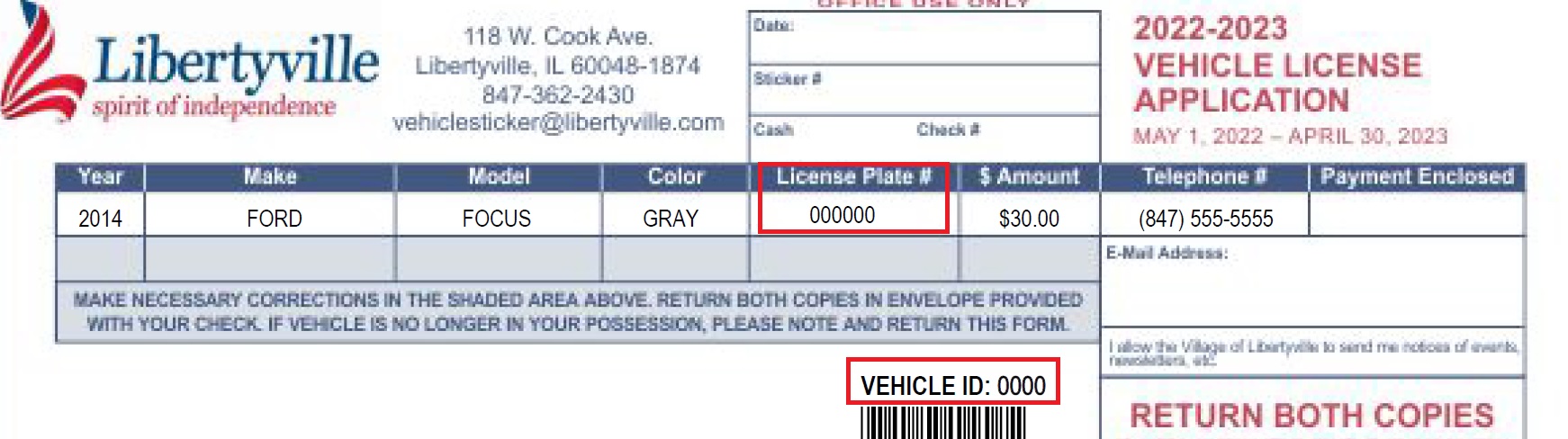The Village now offers residents and businesses the ability to purchase annual vehicle stickers online with a credit card. Vehicle sticker renewal applications are normally sent out to prior year purchasers by mid-March. To purchase your renewal sticker online, you will need the vehicle's license plate number and the four or five digit Vehicle ID number shown on the top of the barcode area on the application you receive in the mail. Click here for an illustration of where this information is located on your vehicle sticker renewal application.