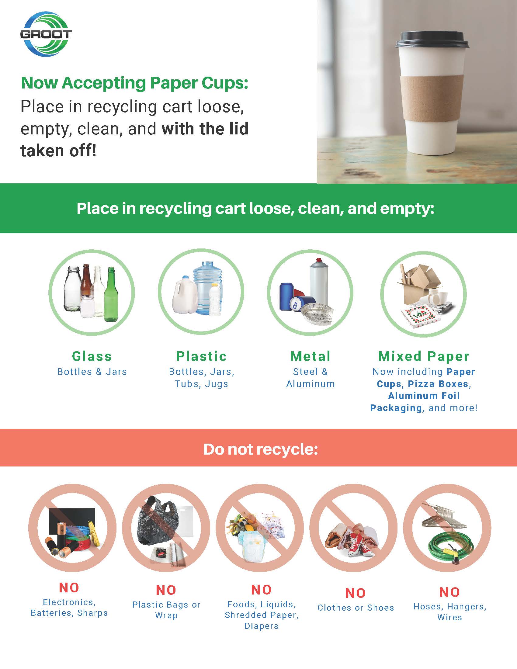 The Village's waste hauling service, Groot, has announced that it now accepts paper cups for recycling! This includes disposable coffee cups. Simply place your empty, clean cup loose in the recycling bin! Please note that lids are not recyclable.